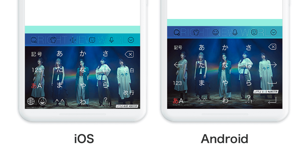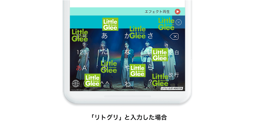 入力エフェクト機能とは、ユーザーが文字を入力し、変換候補より特定のキーワードを選択することで画像がキーボード上に現れる機能です。「Little Glee Monster」関連のワードを入力することで楽しむことができます。入力エフェクトは1種類。関連ワードに設定されているエフェクトを体験してください。