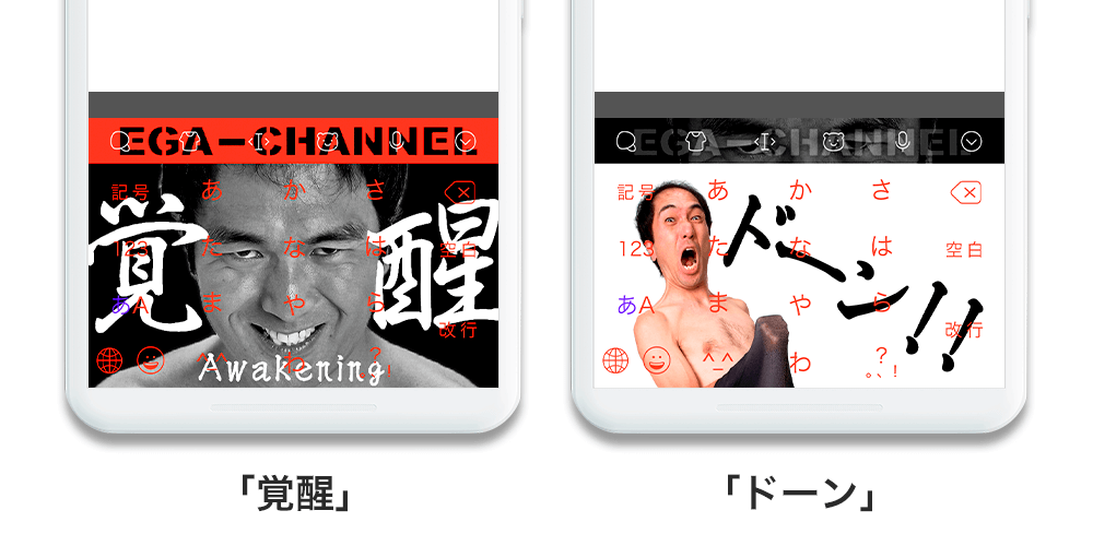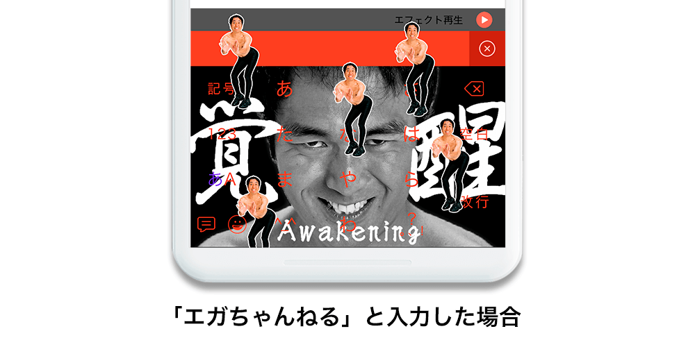 入力エフェクト機能とは、Simejiキーボード上でユーザーが文字を入力し、変換候補より特定のキーワードを選択することで画像がキーボード上に現れる機能です。「エガちゃんねる」など関連のワードを入力すると江頭2:50の「エガちゃんエフェクト」がキーボード上を暴れまわります。関連ワードを探して、エフェクトをお楽しみください。