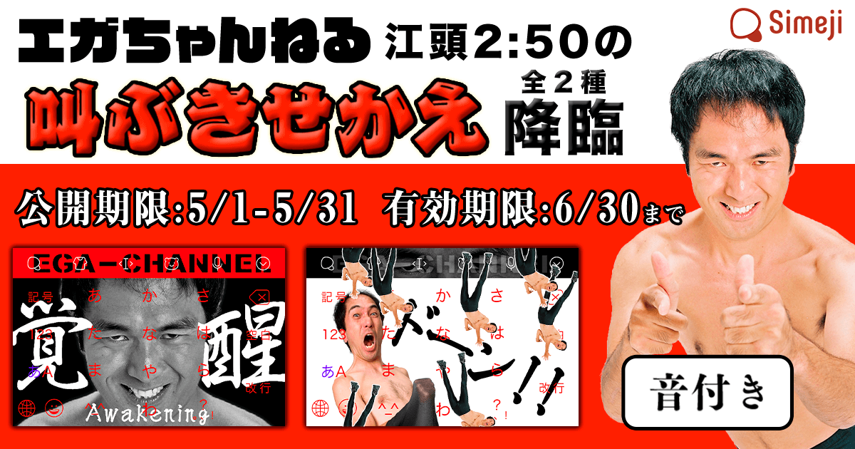 ダウンロードNo.1キーボードアプリ*「Simeji」、 伝説のお笑い芸人「江頭2:50」のYouTubeチャンネル「エガちゃんねる」と 「江頭2:50叫ぶきせかえキーボード」期間限定コラボを実施!