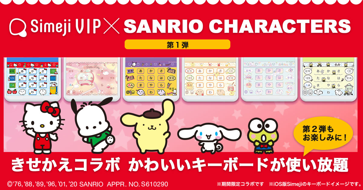 ダウンロードNo.1キーボードアプリ*「Simeji」、 サブスクリプションサービス「Simeji VIP」にて、 大人気の「サンリオキャラクターズ」と期間限定コラボ決定!