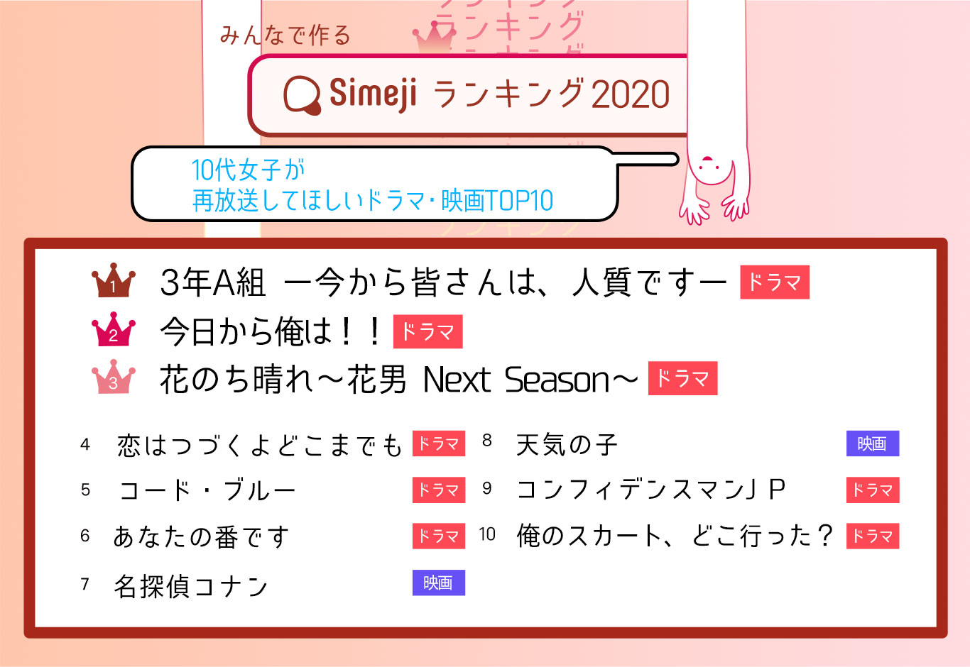 Simejiランキング 日テレ、TBS、フジ!? こんな時だからこそ! Simejiランキング10代女子1,800人が選んだ 「再放送してほしいドラマ・映画 TOP10」