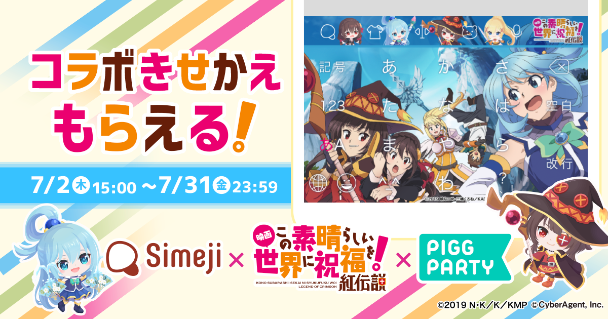 ダウンロードNo.1キーボードアプリ*「Simeji」、 アバターコミュニティアプリ『ピグパーティ』と 『映画 この素晴らしい世界に祝福を!紅伝説』との期間限定コラボ開始!