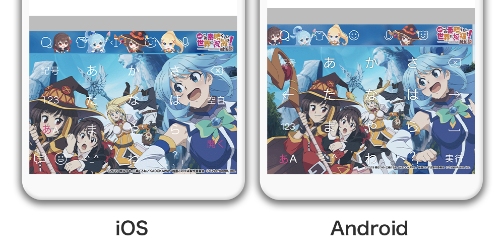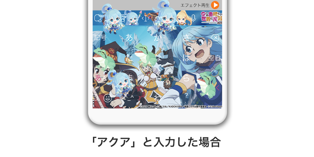 入力エフェクト機能とは、音声エフェクト同様ユーザーが文字を入力し変換候補より特定のキーワードを選択することで、画像がキーボード上に現れる機能です。「アクア」や他の関連ワードを入力することで「このすば」キャラクターのイラストがキーボード上に現れます。ワードを入力して、当コラボレーションならではのエフェクトを体験してください。入力エフェクトを実行するキーワードは『ピグパーティ』内のお知らせで紹介しています。