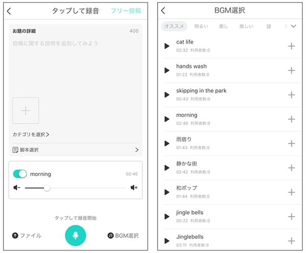 これまではスマートフォンで録音した5分以内の音声しか投稿できませんでしたが、ツール実装により、録音した音声にLisPon側で用意した音楽(提供当初 58種類)を投稿するボイスにつけることができます。今後、ボイス自体を編集できる機能も追加する予定です。