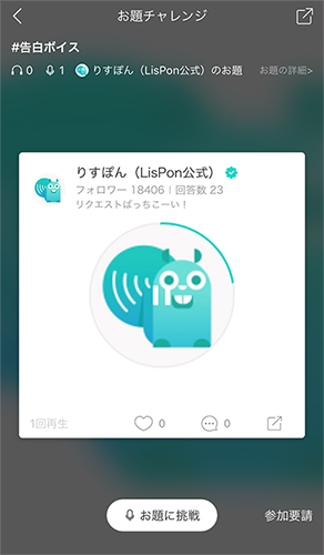 ユーザーやLisPon運営スタッフが声を入れてほしい相手を指定せずに「お題」としてLisPonに投稿し、お題に対してボイスを投稿できるコーナーを開設しました。自身で作った「お題」に対して投稿することも、お気にりのキャストに参加していただけるよう「参加要請」をすることもできます。「お題」はオリジナルのセリフやシチュエーション、画像にあったコメントなどです。(例:#告白ボイスお題 体育館裏で私にロマンチックな告白をしてください など)お題は「#告白ボイスお題」のようなハッシュタグ形式で生成され、簡単にアクセスすることができます。