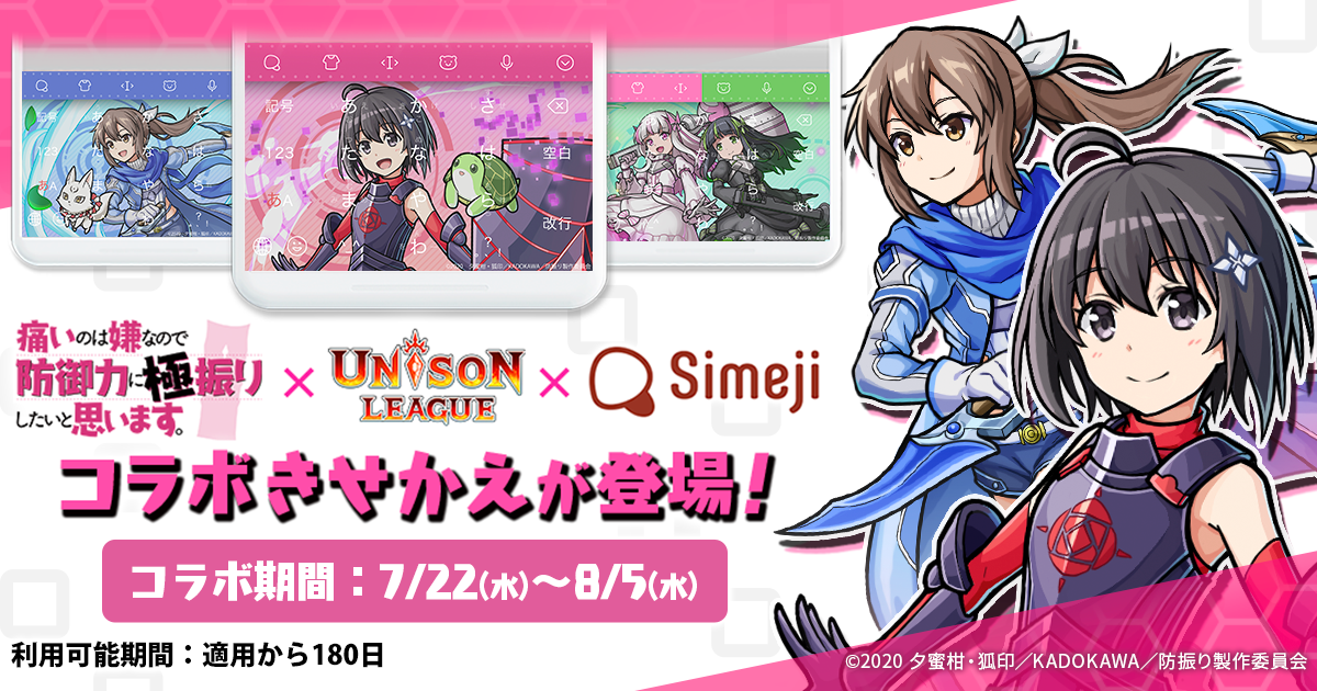 ダウンロードNo.1キーボードアプリ*「Simeji」、 新感覚リアルタイムRPG『ユニゾンリーグ』と TVアニメ『痛いのは嫌なので防御力に極振りしたいと思います。』との 期間限定コラボ決定!