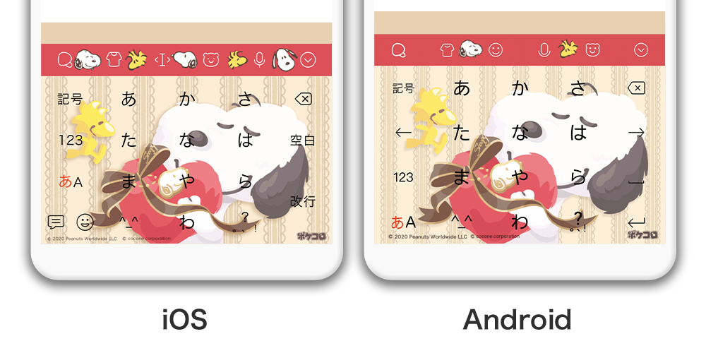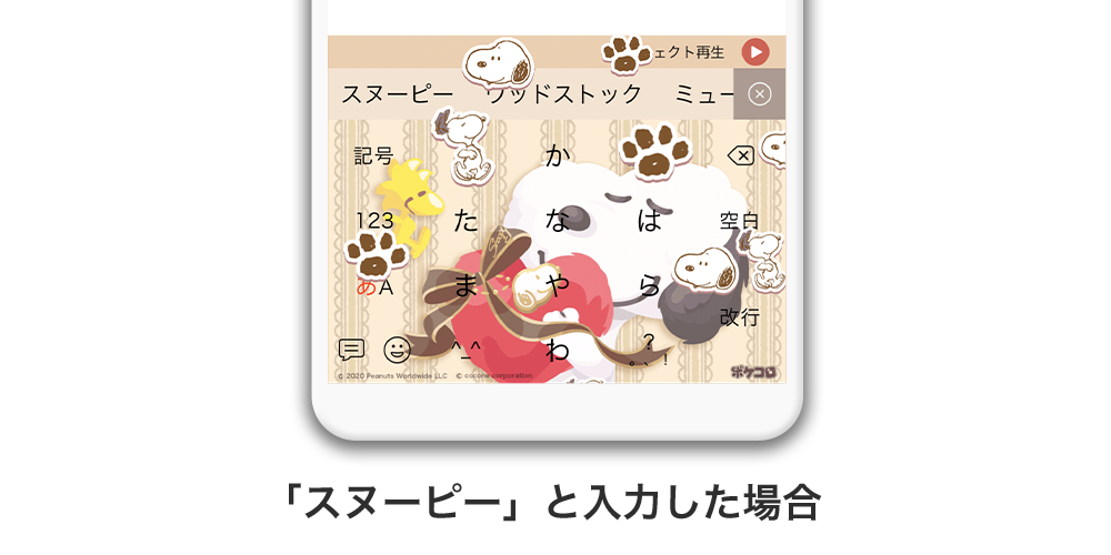 入力エフェクト機能とは、ユーザーが文字を入力し、変換候補より特定のキーワードを選択することで画像がキーボード上に現れる機能です。「スヌーピー」や他の関連ワードを入力することで可愛いイラストがキーボード上に現れます。ワードを入力して、当コラボレーションならではのエフェクトを体験してください。