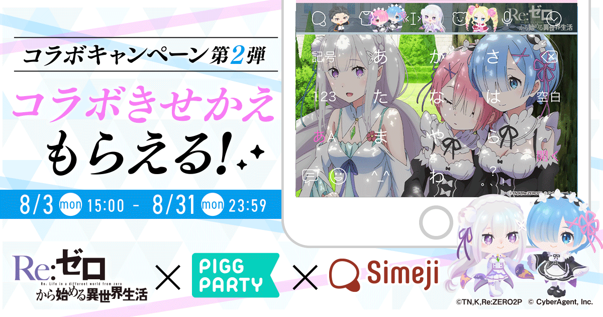ダウンロードNo.1キーボードアプリ*「Simeji」、 アバターコミュニティアプリ『ピグパーティ』、アニメ『Re:ゼロから始める異世界生活』との期間限定コラボ開始!