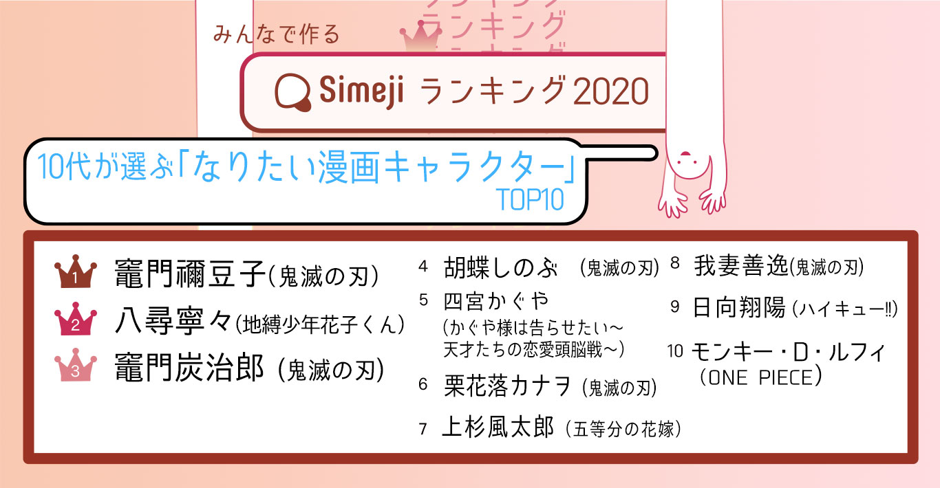 前回のSimejiランキング「おすすめしたい漫画TOP10」(https://simeji.me/simeji-ranking/backnumber/2020_28/)に続いて、今回さらに「なりたい漫画キャラクター」を調査しました。