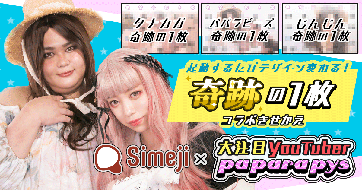 ダウンロードNo.1キーボードアプリ*「Simeji」、 人気急上昇中の男女2人組YouTuber「パパラピーズ」との 「起動するたびデザイン変わる!『奇跡の一枚』コラボきせかえ」を提供開始!