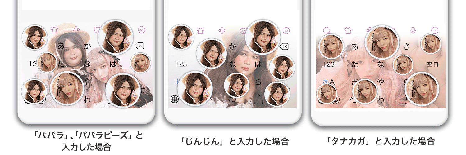 入力エフェクト機能とは、Simejiキーボード上でユーザーが文字を入力し、変換候補より特定のキーワードを選択することで画像がキーボード上に現れる機能です。「パパラピーズ」「じんじん」「タナカガ」など関連のワードを入力すると「パパラピーズエフェクト」がキーボード上を埋め尽くします。キーワードを入力して当コラボレーションならではのエフェクト体験をお楽しみください。