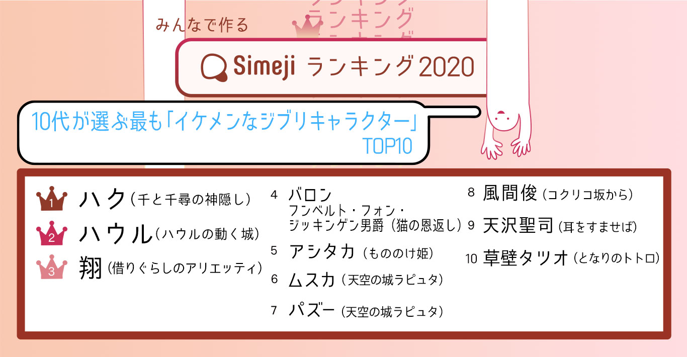 令和時代の10代2,600人が選ぶ 「最もイケメンなジブリキャラクターTOP10」 Simejiランキングが発表!!