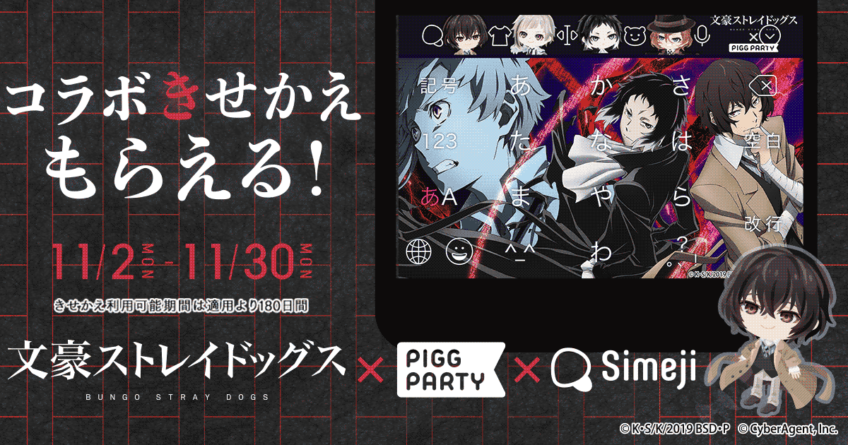 ダウンロードNo.1キーボードアプリ*「Simeji」、 アバターコミュニティアプリ『ピグパーティ』、 大人気バトルアクション作品『文豪ストレイドッグス』との期間限定コラボ開始!