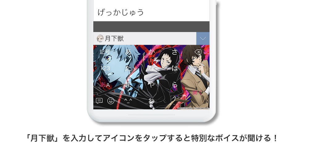 入力エフェクト機能とは、ユーザーが文字を入力し、変換候補より特定のキーワードを選択することで画像がキーボード上に現れる機能です。「中島敦」や他の関連ワードを入力することで、「文豪ストレイドッグス」のキャラクターイラストがキーボード上に現れます。ワードを入力して、当コラボレーションならではのエフェクトを体験してください。