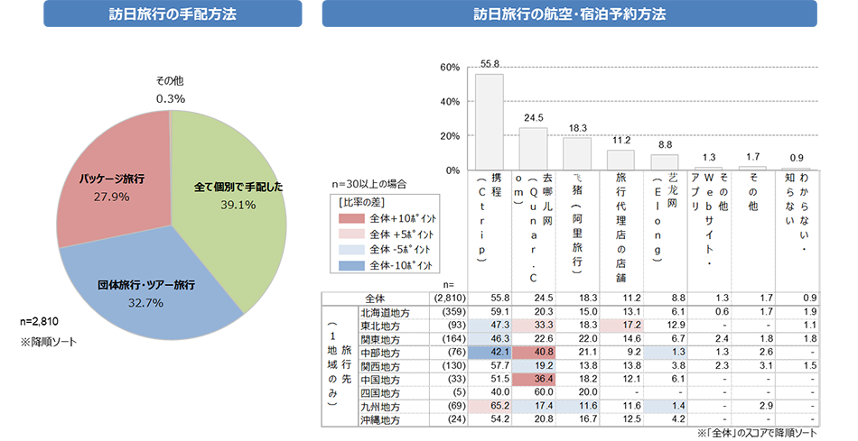 訪日旅行の手配方法は個別手配が39%で最多。次いで団体・ツアー旅行が32%、パッケージ旅行が28%で僅差。予約方法では、「携程(Ctrip)」(56%)が最多で半数以上が利用。2位の「去哪儿网(Qunar.Com)」(25%)とは30ポイント以上差が開いている。