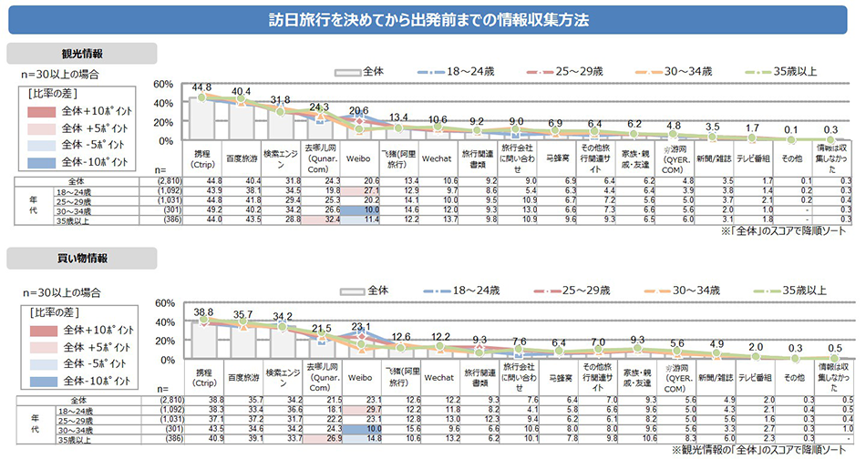 訪日旅行前の情報収集は観光情報・買い物情報ともに「携程(Ctrip)」、「百度旅游」、「検索エンジン」の順に多い。