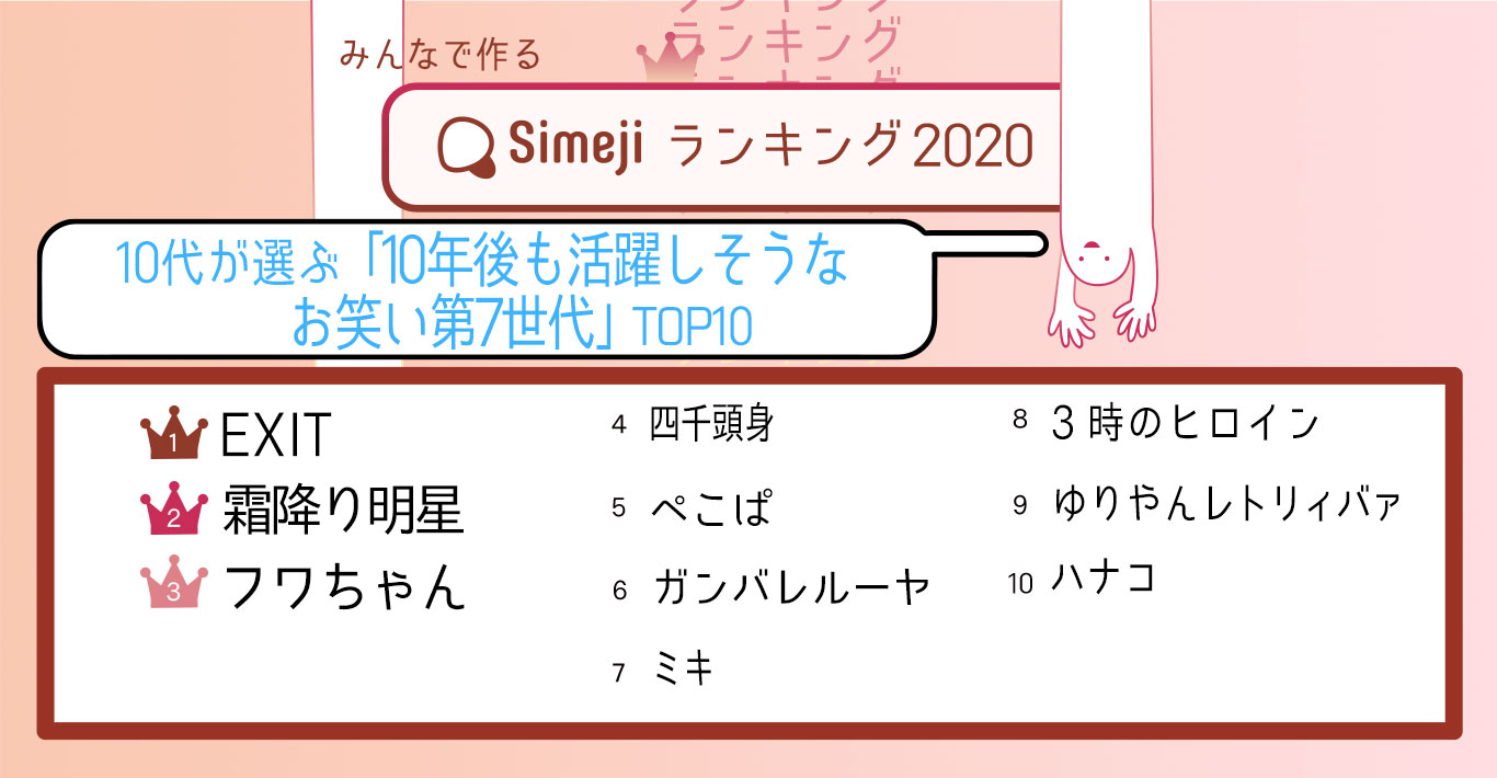 新時代は型破り!? Simejiランキング10代3,600人が選ぶ 「10年後も活躍しそうなお笑い第7世代」TOP10