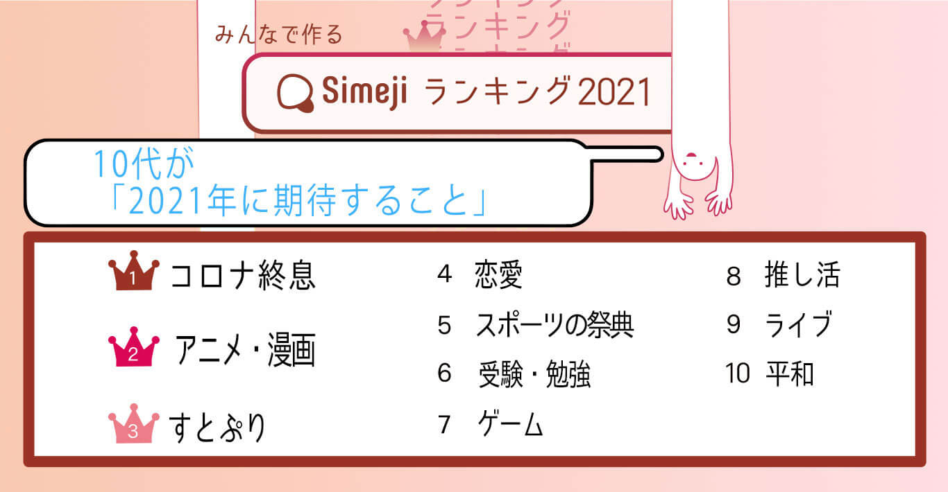 激動の2020年が過ぎ、新たな年を迎えました。昨年は未知のウイルスの猛威に世界中が翻弄されながら、毎日の創意工夫が求められる一年となりましたね。世の中が日常を取り戻すまでにはまだもう少し時間がかかりそうですが、今年若者はどんなことに夢中になり、何にワクワクしながら過ごすのでしょうか。Simejiランキングは10代が「2021年に期待すること」TOP10を調査しました。