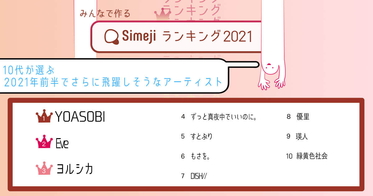 Simejiランキング 10代2,600人が選ぶ 「2021年前半でさらに飛躍しそうなアーティスト」