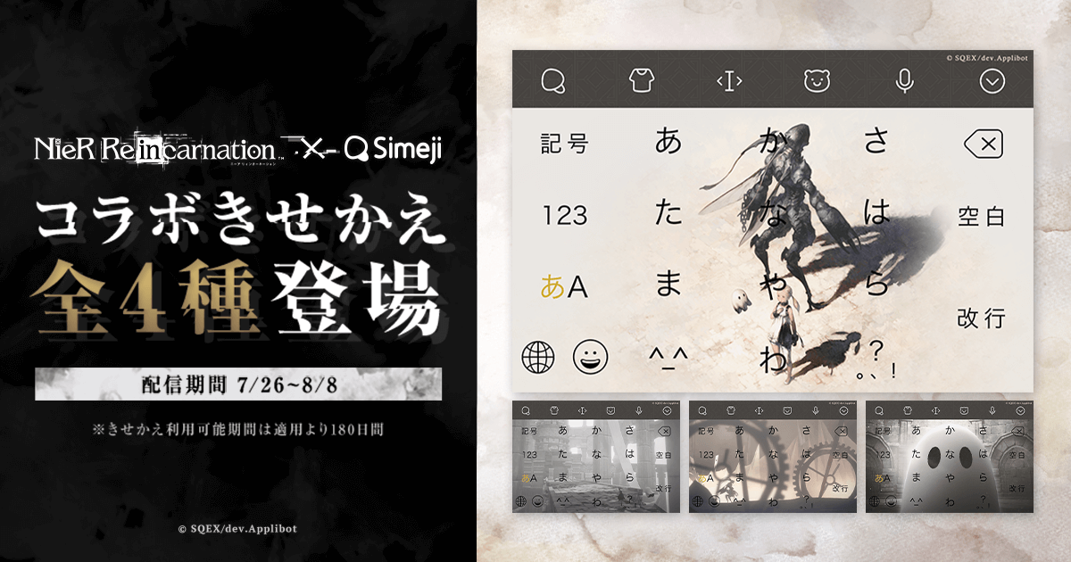 バイドゥ株式会社(本社:東京都港区、代表取締役社長:Charles Zhang)が提供する日本語入力&きせかえ顔文字キーボードアプリ「Simeji」(iOS、Android版)は、株式会社スクウェア・エニックス(本社:東京都新宿区、代表取締役社長:松田 洋祐)より好評配信中の「NieR」シリーズ初のスマートフォン向けタイトル『NieR Re[in]carnation(ニーア リィンカーネーション)』との期間限定きせかえを本日より2021年8月8日(日)まで実施します。