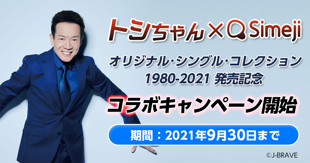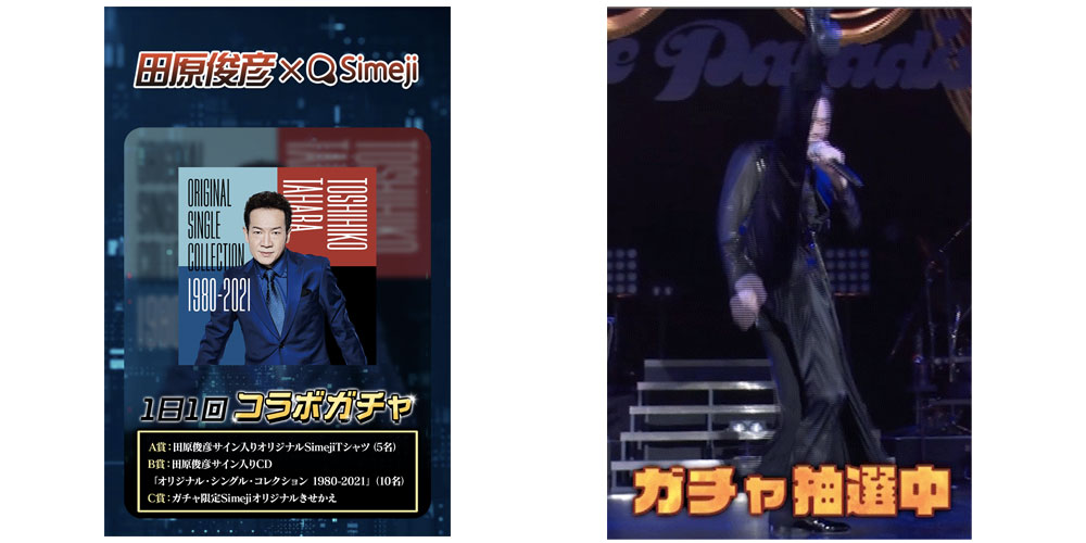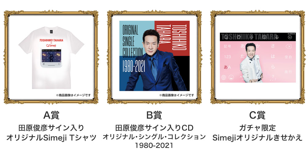 特設サイト(https://api.simeji.me/static/wap/sj-tahara-spell.html)にて、オールタイムベスト「オリジナル・シングル・コレクション 1980-2021」のジャケット写真を使用した豪華景品(サイン入りTシャツ5名様、サイン入りCD10名様)が合計15名様に当たる「トシちゃん×Simejiガチャ」を実施します。毎日無料で1回挑戦でき、さらに結果をTwitterでシェアすることで1日最大2回挑戦することが可能です。景品の中には、Simejiオリジナルきせかえデザインもご用意しております。
