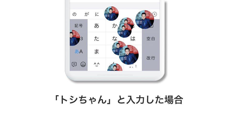 ユーザーが文字を入力し、変換候補より特定のキーワードを選択することで画像や動画がキーボード上に現れる機能です。
