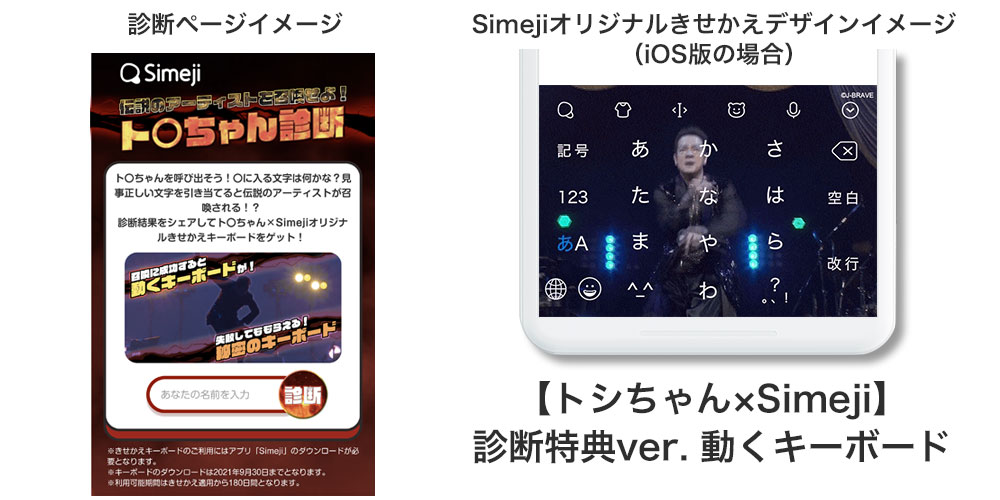 本コラボレーションでは、オールタイムベストをモチーフにしたデザインをあしらった、Simejiオリジナルきせかえ4種がダウンロードできる他、特定のキーワードを入力することによりキーボード上にジャケット画像が現れるエフェクト機能を提供します。また、特設サイトではあなたが伝説のアーティストを召喚できるかを診断できる「ト◯ちゃん診断」や、今回のコラボのためだけに制作されたオリジナルグッズが当たる「トシちゃん×Simejiガチャ」に無料で挑戦できます。