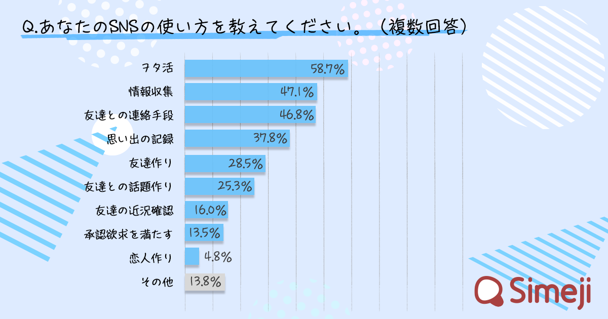 最後に、SNSの使い方について質問したところ、「ヲタ活(58.7%)」との回答が半数以上となりました!続いて、「情報収集(47.1%)」、「友達との連絡手段(46.8%)」という結果になりました。