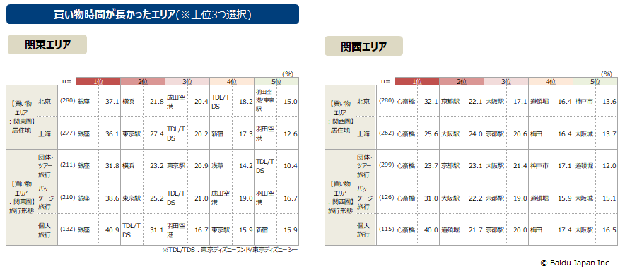 一番買い物したエリアは大阪府で、中でも心斎橋での買い物時間が長い。他、「大阪駅」「京都駅」「神戸市」が上位に挙がる。個人旅行者では「道頓堀」が2位となっている点が目立つ。