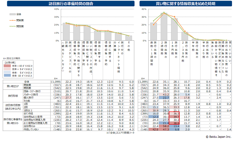 旅行準備時間の2割弱を「買い物リストの作成や買い物に関する情報収集、予約」に費やしている。買い物に関する情報収集を始めた時期は、全体では「旅行出発の2週間前」(35%)、「1カ月前」(28%)、「直前~1週間前」(23%)の順。