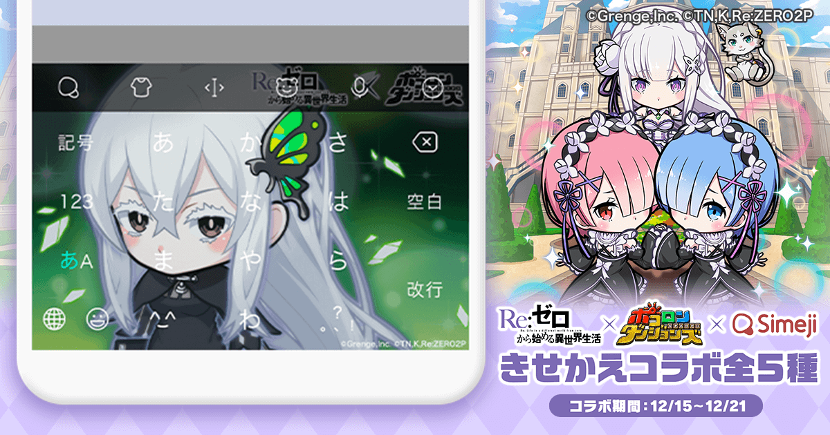バイドゥ株式会社(本社:東京都港区、代表取締役社長:Charles Zhang)が提供する日本語入力&きせかえ顔文字キーボードアプリ「Simeji」(iOS、Android版)は、なぞるパズルRPG『ポコロンダンジョンズ』、人気TVアニメ『Re:ゼロから始める異世界生活』との期間限定コラボを本日より2021年12月21日(火)まで実施します。