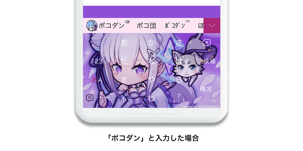 音声エフェクト機能とは、Simejiキーボード上でユーザーが文字を入力し、変換候補より特定のキーワードを選択することで音声が再生される機能です。「ポコダン」と入力後、キーワードを選択することで「リゼロ」のキャラクターレムのボイスが再生されます。ぜひマナーモードを解除して、限定音声をお楽しみください。