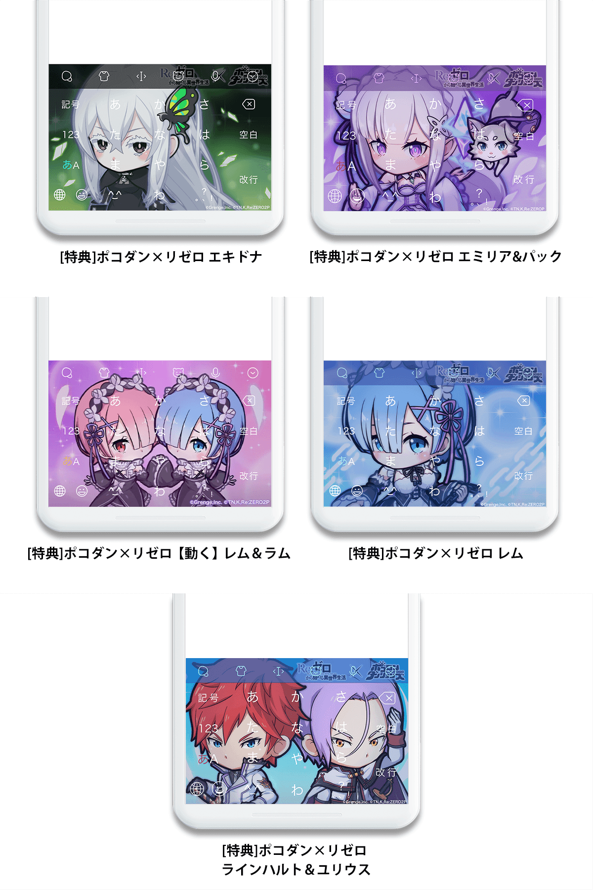 本コラボレーションでは、ミッションクリアにより『ポコロンダンジョンズ』とコラボする『Re:ゼロから始める異世界生活』の登場キャラクターをあしらったSimejiオリジナルのコラボきせかえデザインのダウンロードが可能となります。今回のコラボ新登場のきせかえ1種、過去コラボ第一弾、第二弾の復刻きせかえ4種の計5種類のきせかえを提供します。また特定のキーワード入力によりキャラクターボイスが流れる「音声エフェクト機能」や、キーボード上に特殊な演出が施される動画エフェクト等の機能をお楽しみいただけます。