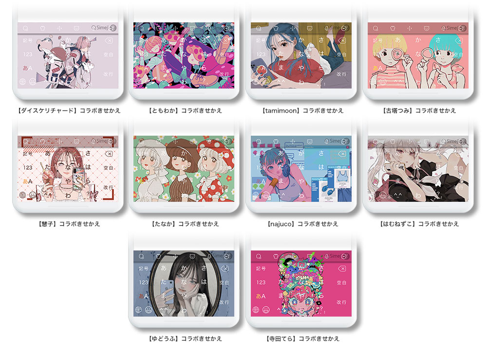 10名の人気イラストレーターが今回のコラボのためにイラストを書き下ろし。ガチャを引くと必ずオリジナルきせかえが当たります。どのイラストレーターのきせかえが当たるかは、ガチャを引いてからのお楽しみ!特設ページ(https://api.simeji.me/simeji-appui/h5/diagnosticactivity?key=sj-gacha-template-share&v=19)にアクセスし、毎日無料で1回挑戦することができます。さらに結果をSNSでシェアすることで1日最大2回挑戦することが可能。ぜひ毎日チャレンジしてきせかえをゲットしてください。