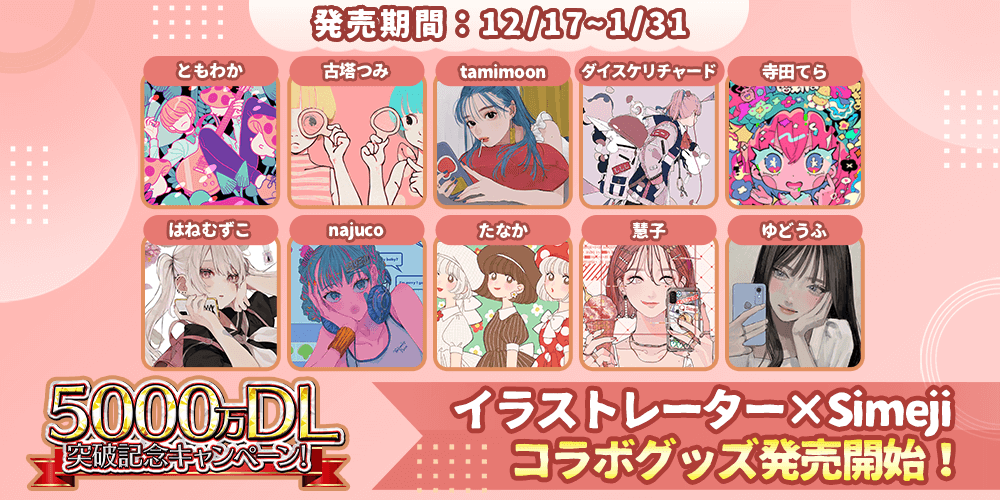 バイドゥ株式会社(本社:東京都港区、代表取締役社長:Charles Zhang)が提供する日本語入力&きせかえ顔文字キーボードアプリ「Simeji」(iOS、Android版)は、累計DL数が5,000万(※)突破したことをお知らせします。記念して、本日より「5000万ダウンロード突破記念キャンペーン」を開始します。本キャンペーンでは、総勢10名の人気イラストレーターとコラボし、Simejiオリジナルきせかえが当たる「ガチャ」や、オリジナルグッズの販売を実施します。また、スマートフォンでのタイピングの速さを競い合う「タイピンググランプリ」もお楽しみいただけます。