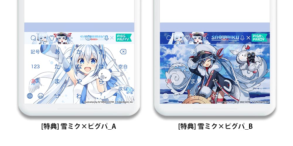 本コラボレーションでは、ミッションクリアにより「ピグパーティ」とコラボする「雪ミク」のSimejiオリジナルコラボきせかえデザイン2種がダウンロード可能となります。また特定のキーワード入力によりキーボード上に画像が現れる「入力エフェクト機能」をお楽しみいただけます。