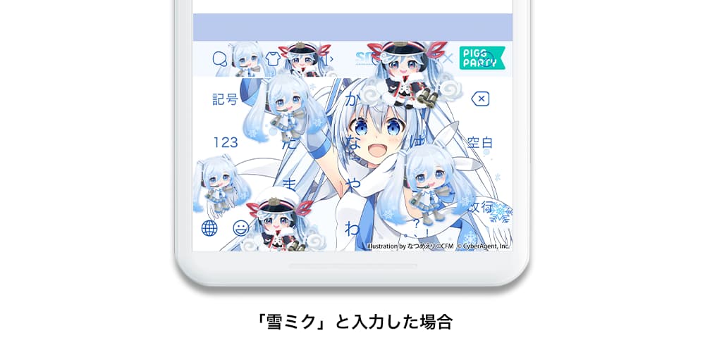 入力エフェクト機能とは、ユーザーが文字を入力し、変換候補より特定のキーワードを選択することで画像がキーボード上に現れる機能です。「雪ミク」と入力することで、画像がキーボード上に現れます。ワードを入力して、当コラボレーションならではのエフェクトを体験してください。