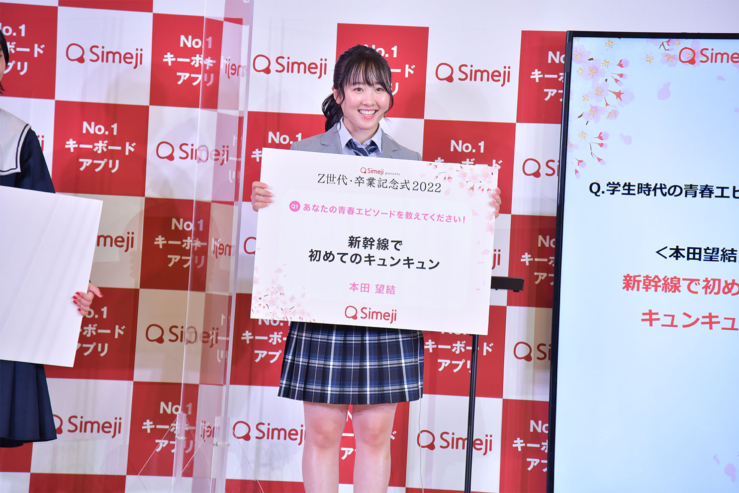 大人世代代表としてお笑いコンビ平成ノブシコブシの吉村崇さん、徳井健太さん、Z世代代表として現役高校生の本田望結さんと今年成人式を終えたばかりの山之内すずさんが登壇。アプリ「Simeji」のユーザーに「卒業」と「青春」をテーマにアンケートを実施、結果をランキング化し、イベント内で発表しました。さらにSimejiの新しいWeb CMを初公開!