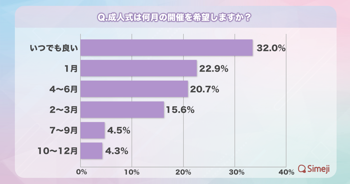成人式の実施時期は、「いつでも良い(32.0%)」に次いで、「1月が良い」と回答22.9%という結果に。