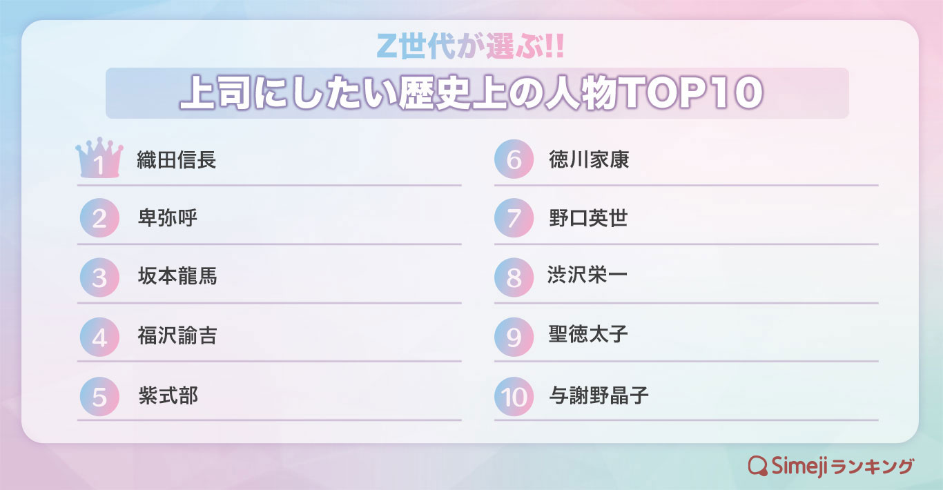 4月といえば入社式。新しい環境にドキドキしながら入社式を迎える方もいるのではないでしょうか。Z世代に「もし歴史上の人物が上司だったら…?」と、理想の上司について調査しました。乱世を勝ち抜いた戦国武将だけでなく、頭脳明晰な印象のある女性が3人ランクイン!また、交渉術に長けている坂本龍馬、医学を志し人を助けることに生涯を捧げた野口英世や、平等に部下を評価してくれそうな聖徳太子など、さまざまな時代・分野から、歴史上の人物がTOP10入り。Z世代の理想の上司像とは?「部下を引っ張っていってくれる」という点だけではなく、その考え方や人柄も注目されているようです。