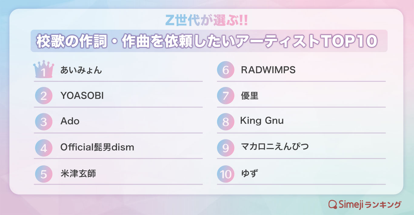 Z世代が選ぶ!!「校歌の作詞・作曲を依頼したいアーティストTOP10」