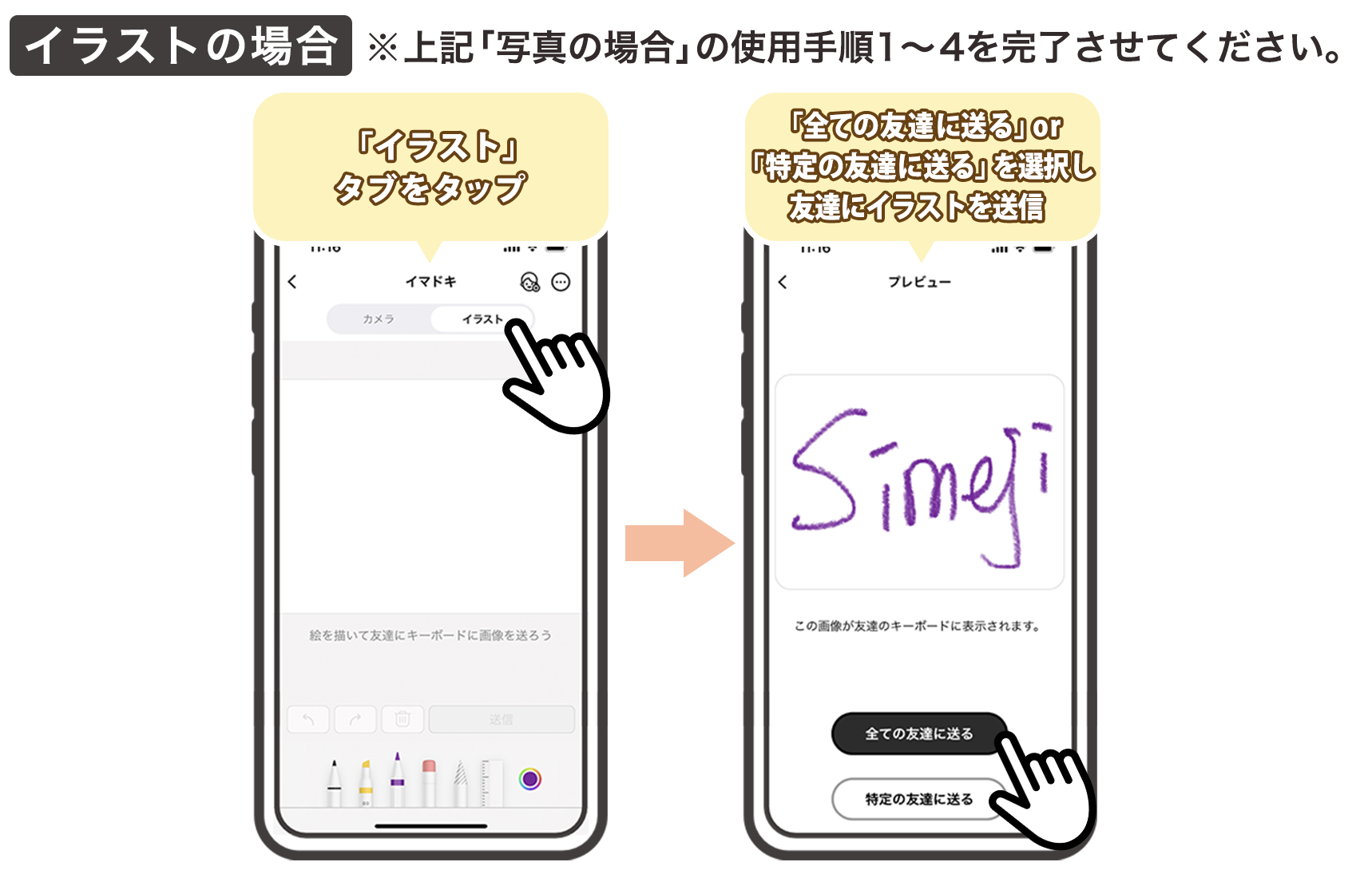 3.「全ての友達に送る」or「特定の友達に送る」を選択し、友達にイラストを送信。