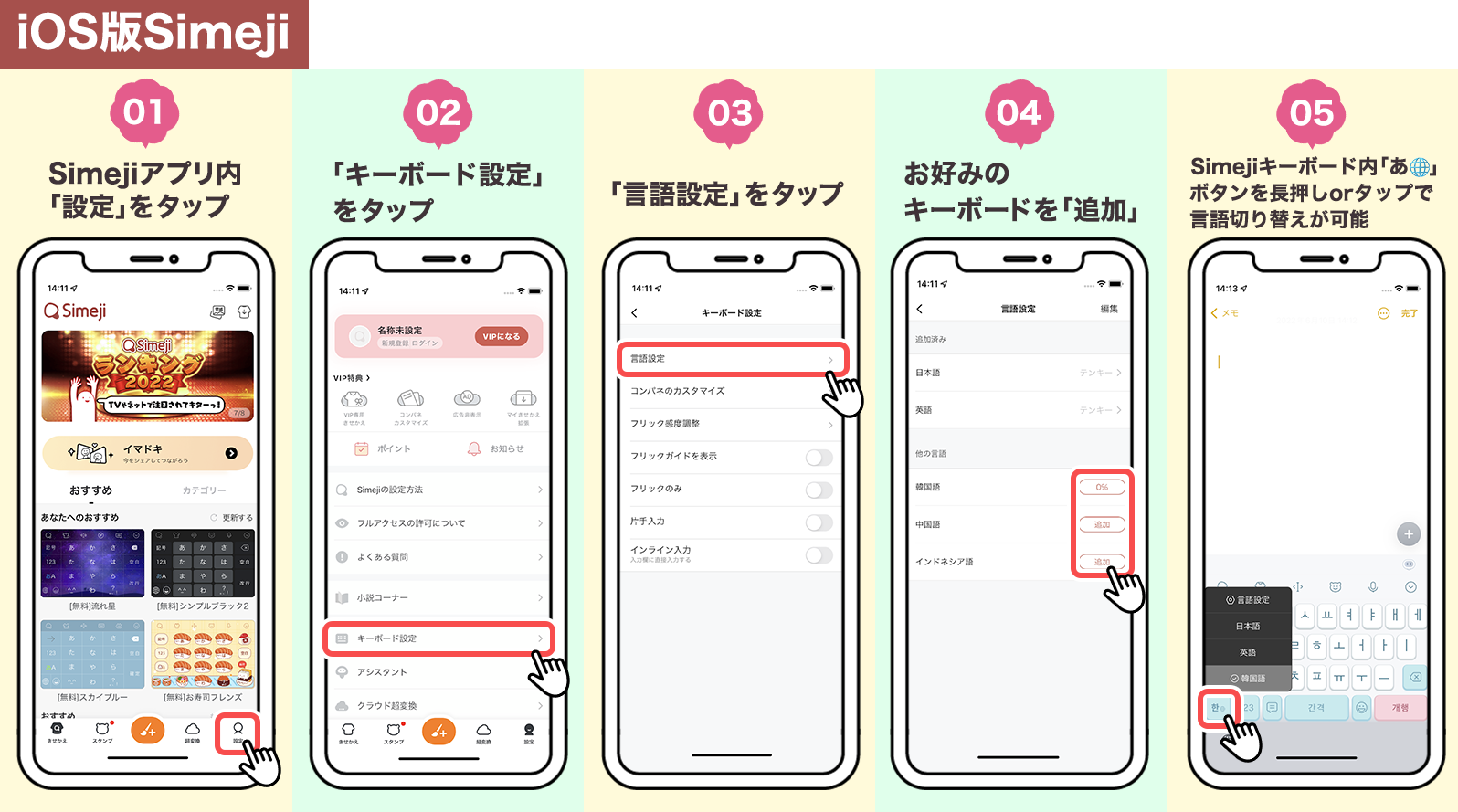 普段から多言語を活用される方はもちろん、最近ではSNSで投稿する際にハッシュタグを韓国語で記載するなど、日本語以外の言語を使用する機会も増えたのではないでしょうか。Simejiの新機能「多言語キーボード」を使い、一度お好みの言語を追加すれば、「言語切り替えボタン」をタップor長押しするだけで簡単に入力変換することができます(アプリ切り替え不要)。ぜひ、この機会にお試しください!