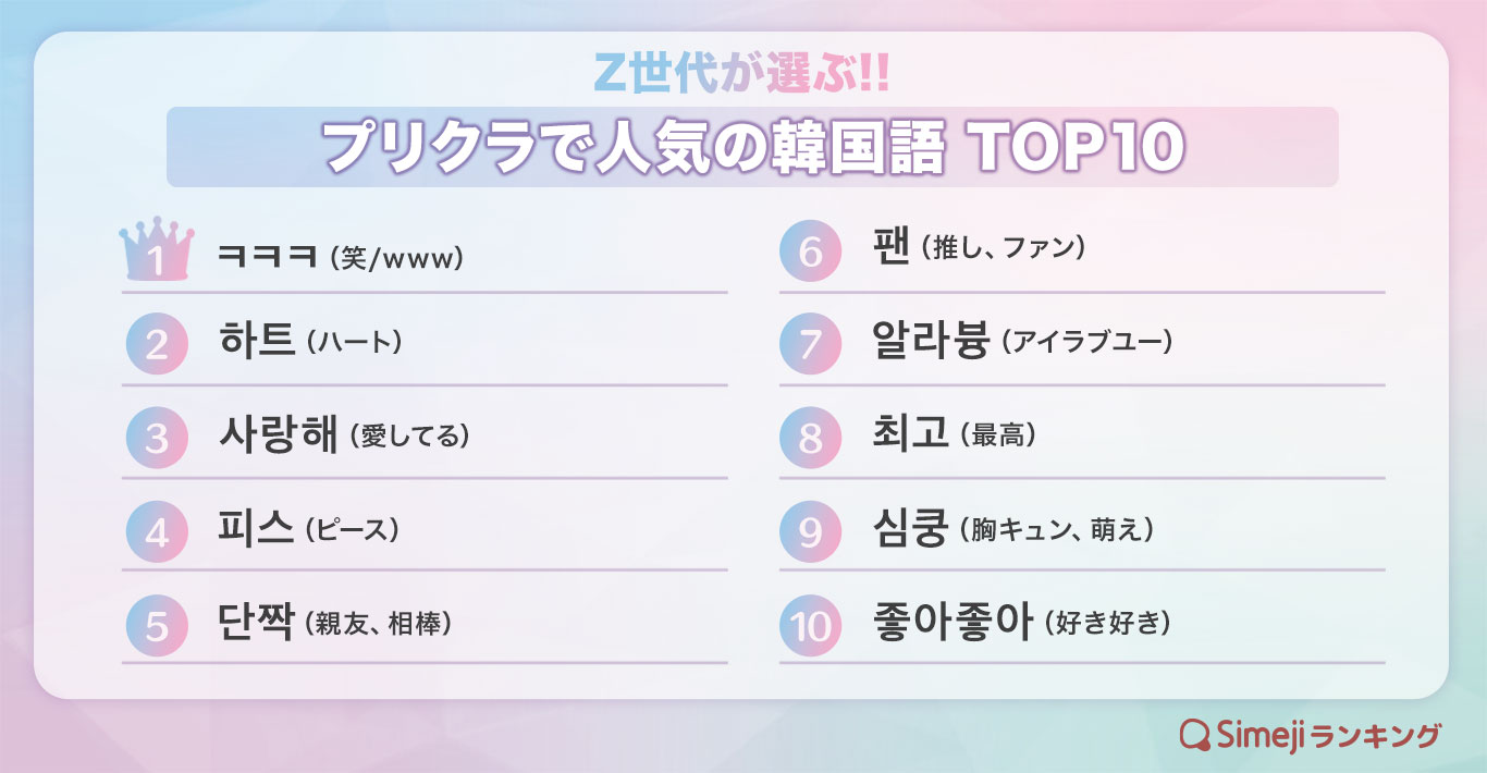 【Simejiランキング】Z世代が選ぶ!! 「プリクラで人気の韓国語TOP 10」