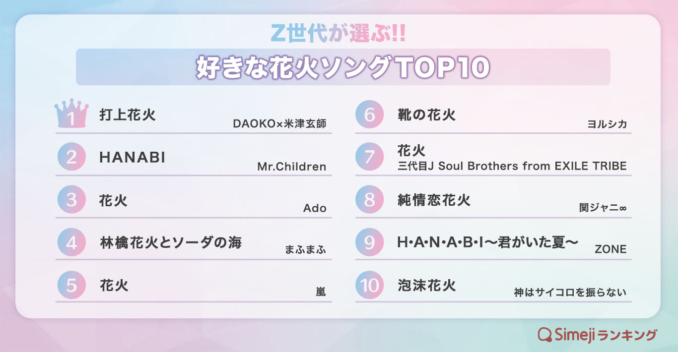 【Simejiランキング】Z世代が選ぶ!! 「好きな花火ソングTOP 10」