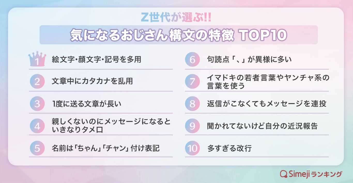 【Simejiランキング】Z世代が選ぶ!! 「気になるおじさん構文の特徴TOP 10」