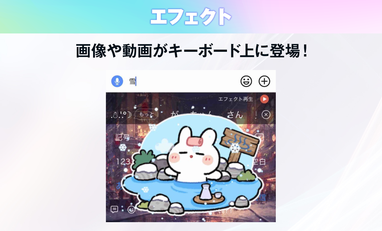 特定のキーワードを入力すると、画像や動画がキーボード上に現れる機能。キーボード上に突然サプライズが降ってくる?!ユーザーから「何か上から降ってきたぞ!!」といつも話題になる機能。