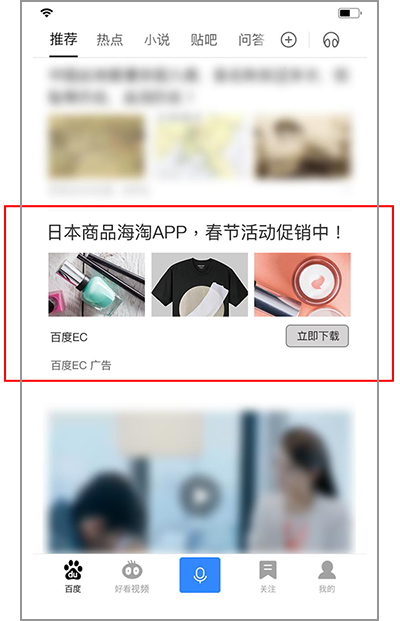 百度検索アプリ「手机百度」(MAU約6億)では、の従来のリスティング広告とインフィード広告の中でにアプリインストール広告を表示する形式と、百度が提供する中国国内最大級のA ndroid向けアプリストア(百度手机助手、3000万DAU)内に、アプリ広告を導入することとなりました。