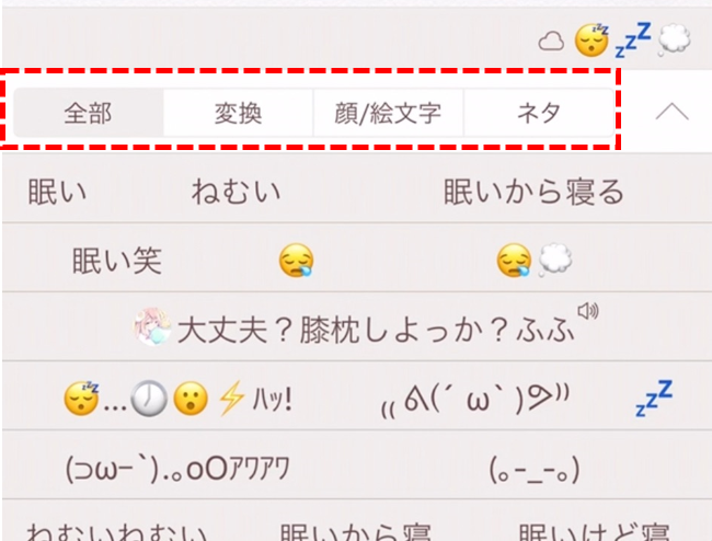 キーボードに文字を入力すると変換候補画面に「全部」「変換」「顔/絵文字」「ネタ」のタブが表示されます。変換候補のカテゴリを選択することができます。