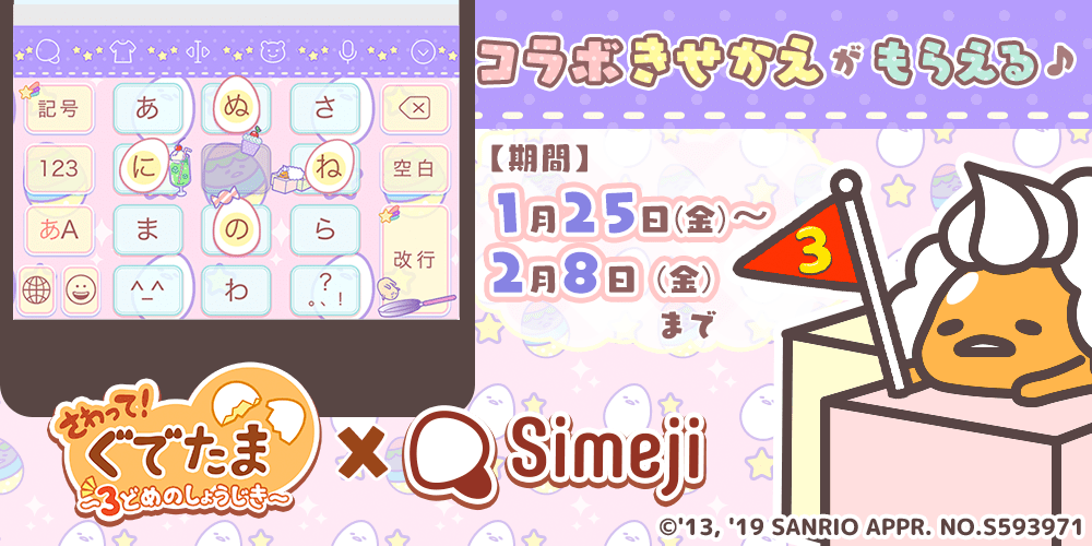 バイドゥ株式会社(本社:東京都港区、代表取締役社長 Charles Zhang)が提供する日本語入力&きせかえ顔文字キーボードアプリ「Simeji」(iOS、Android版)は、人気キャラクター「ぐでたま」が登場するスマートフォン向けアプリ「さわって!ぐでたま ~3どめのしょうじき~」と期間限定で第二弾コラボキャンペーンを本日より2月8日(金)まで展開します。